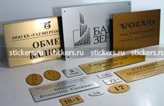 В данном разделе речь пойдет о наиболее распространенном типе офисных табличек и фасадных вывесок. Офисные таблички и фасадные вывески серии Metallic изготавливаются из двухслойного металлизированного пластика толщиной 1,6 мм либо 3,2 мм. Верхний металлизированный слой может иметь фактуру и цвет таких металлов как золото, серебро, бронза, алюминий, сталь, никель, может содержать фактурные линии присущие металлопрокату. Табличка серии Metallic, внешним видом полностью имитировать металлическую табличку, но в отличие от металлической таблички, пластиковые металлизированные таблички не подвержены влиянию атмосферных воздействий, солнечному свету и не тускнеют со временем. Таблички изготавливаются лазерной резкой и гравировкой, что позволяет получать любые размеры и формы, а также наносить высококачественные изображения на поверхность таблички.