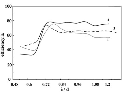 Для высокочастотной отражательной ГДР основные соотношения таковы. Период дифракционной решетки составил 0.39 мкм, пространственная частота, соответственно, 2564 мм-1. Отношение высоты рельефа к периоду решетки составляет . Спектральная зависимость дифракционной эффективности представлена на рис.