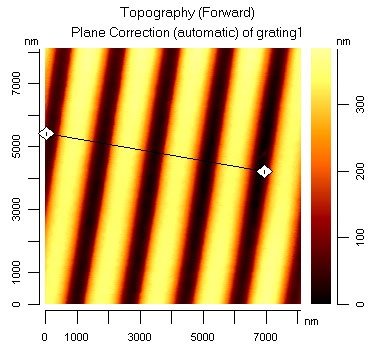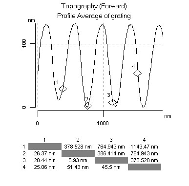 В данных фоторезистах нет наперед заданного параметра светочувствительности. Благодаря уникальным возможностям процесса послеэкспозиционного химического процесса существует возможность существенного увеличения светочувствительности через создание поверхностного рельефа. В результате селективного химического травления (разные скорости травления экспонированных и неэкспонированных участков) исходно амплитудно-фазовая дифракционная решетка преобразуется в рельефно-фазовую. Коэффициент химического усиления по дифракционной эффективности может составлять 1000 – 2000 единиц, что эквивалентно существенному увеличению светочувствительности фоторезиста.__ Голографические дифракционные решетки формировались по симметричной схеме двулучевого интерферометра. При этом синусоидальная интерференционная картина записывающего излучения в конечном счете преобразуется в поверхностный рельеф с симметричным профилем штриха. Для записи использовались две длины волны (0.48 и 0.51 мкм) одномодового, одночастотного аргонового лазера. После преобразования голографической дифракционной решетки в рельефно-фазовую ее поверхность металлизируется – на нее в вакууме наносится алюминиевое покрытие. ГДР становится отражательной. Дифракционная эффективность измерялясь в режиме автоколлимации для двух взаимоортогональных поляризаций света и рассчитывалась для неполяризованного света. Пространственная частота отражательных дифракционных решеток составляла 600, 1200, 2400 мм-1. , Характеристики поверхностного рельефа соответствующих голографических дифракционных решеток исследовались с помощью атомно-силового микроскопа АСМ Carl Zeiss Ultra Objective. Полученные результаты представлены на рисунках 1 и 2. Они наглядно демонстрируют высокое качество постадийной обработки ГДР в процессе изготовления. На стадии химической обработки в оригинальных травителях на поверхности рельефной голографической дифракционной решетки не образуется никаких центров рассеяния, стенки голографического гофра имеют гладкую поверхность. Как результат-низкий уровень рассеянного света. Интенсивность рассеянного света для исследованного интервала пространственых частот отражательных ГДР не превышала (2-5)10-7 на расстоянии 10 Å от центра спектральной линии.