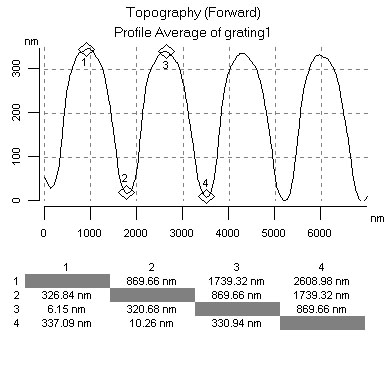 На рисунке представлен профиль рельефа, по которому уточняется пространственная частота рельефа и определяются его параметры. В данном случае период решетки равен 1.74 мкм, что соответствует пространственной частоте 575 мм-1. Висота рельефного виступа составляет 0.18 периода решетки. При этом график спектральной зависимости дифракционной эффективности отражательной ГДР для поляризованного и неполяризованного света имеет вид, показанный на рисунке .